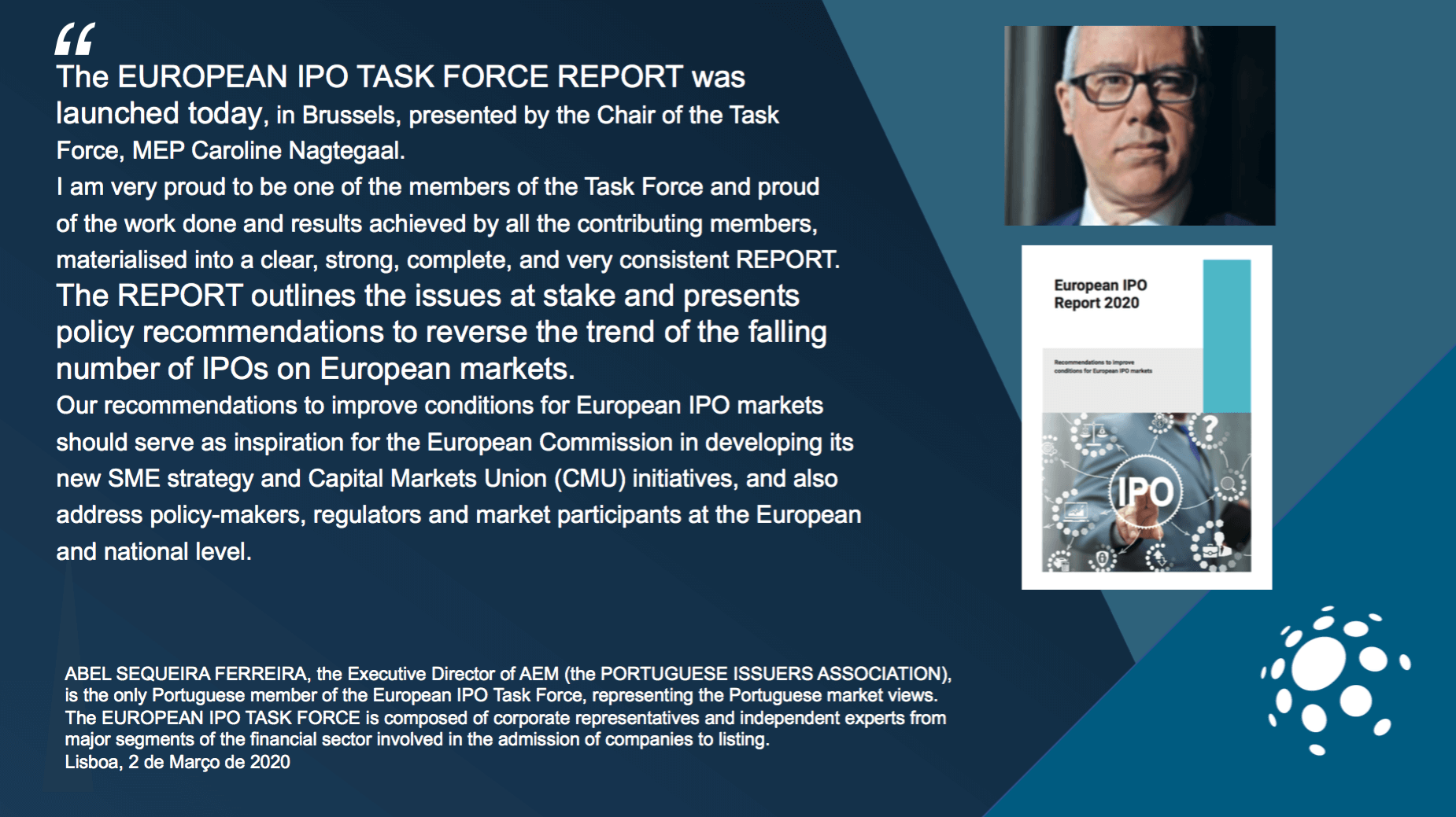 ABEL SEQUEIRA FERREIRA, the Executive Director of AEM (the PORTUGUESE ISSUERS ASSOCIATION), is the only Portuguese member of the European IPO Task Force.