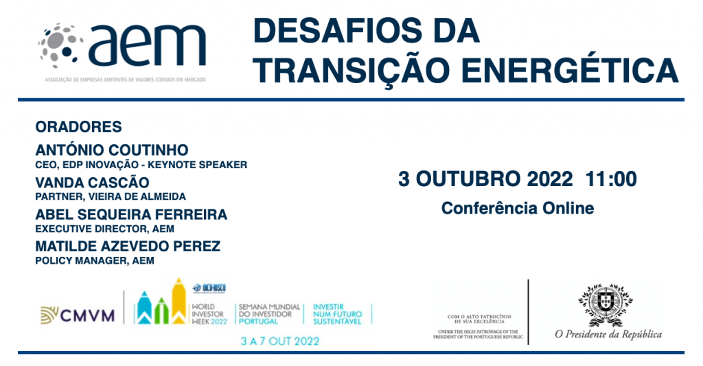 A AEM organizou a Conferência Online “DESAFIOS DA TRANSIÇÃO ENERGÉTICA”, incluída no programa da SEMANA MUNDIAL DO INVESTIDOR 2022, organizada pela IOSCO e pela CMVM, cujo mote é “Investir num futuro sustentável”.