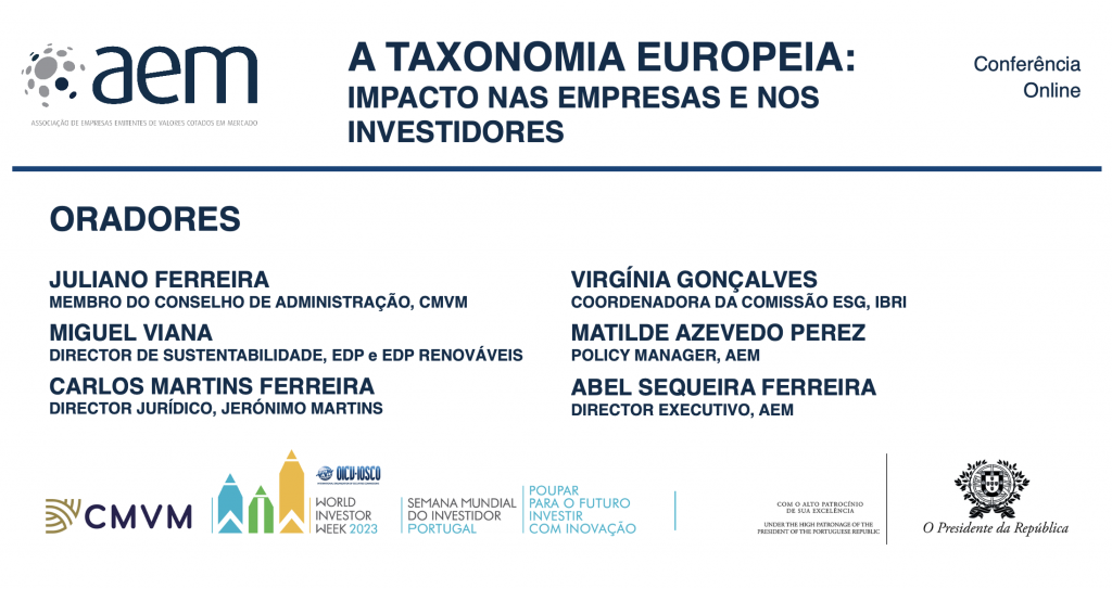 A AEM – ASSOCIAÇÃO DE EMPRESAS EMITENTES DE VALORES COTADOS EM MERCADO, organiza a Conferência Online “A TAXONOMIA EUROPEIA – IMPACTO NAS EMPRESAS E NOS INVESTIDORES: Desafios, Melhores Práticas, Novas Geografias e Perspectivas para o Futuro”.