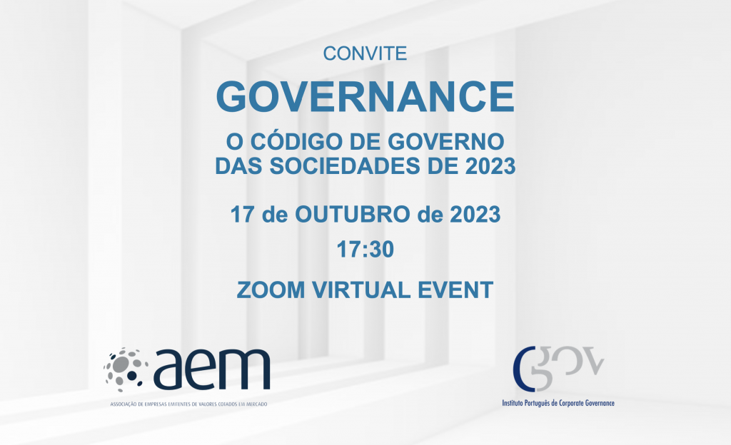 A AEM – ASSOCIAÇÃO DE EMPRESAS EMITENTES DE VALORES COTADOS EM MERCADO em conjunto com o IPCG – INSTITUTO PORTUGUÊS DE CORPORATE GOVERNANCE organiza a e-conference “O CÓDIGO DE GOVERNO DAS SOCIEDADES DE 2023” a qual contará com a intervenção de representantes de ambas as instituições, bem como da CEAM – Comissão Executiva de Acompanhamento e Monitorização do Código.