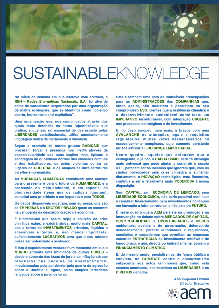 Esta edição de Outubro de 2023 da SUSTAINABLE KNOWLEDGE, excepcionalmente, é divulgada ao público em geral no âmbito da Semana Mundial do Investidor — iniciativa da IOSCO e da CMVM, com o Alto Patrocínio de Sua Excelência o Senhor Presidente da República — da qual a AEM é parceiro fundador.